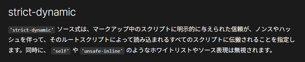 ここでCSPを見ると、script-src 'strict-dynamic'という見慣れない記述がある。