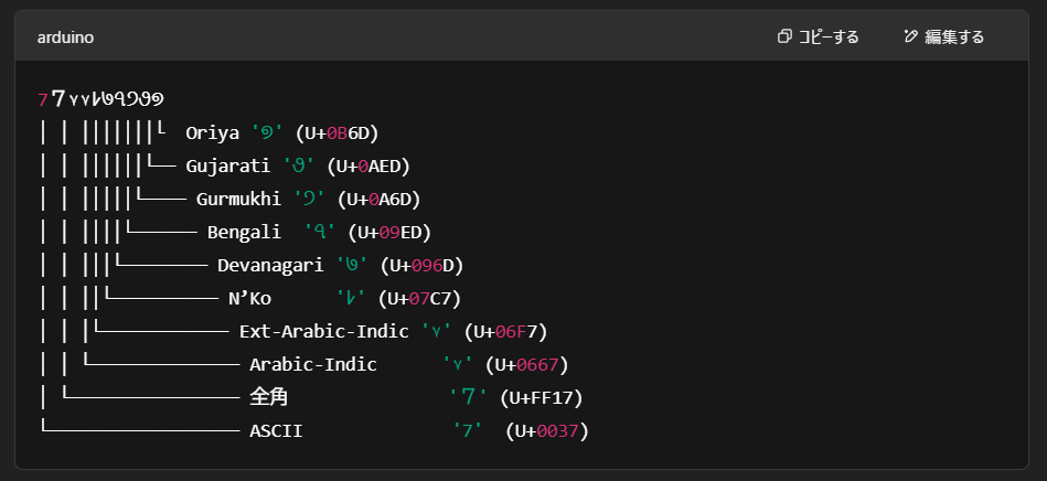 一見0123456789の10文字以外にこれを満たす文字列は無いように思うが、例えば半角の7と全角の7など、正規表現の\dに対応しておりint()で同じ数字に変換できる文字は複数存在する。
