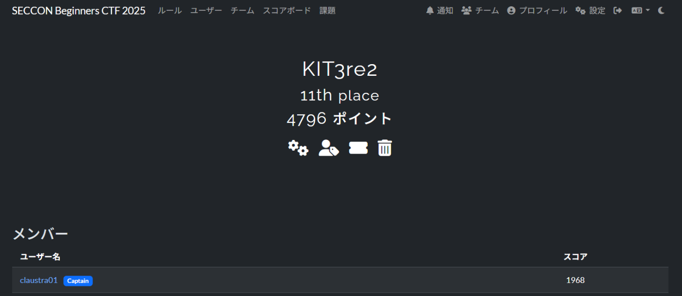 去年に引き続き大学のサークルから派生したチームKIT3re2で今年も参加し、CryptoとRevのボス問以外を解いて880チーム中11位でした。(全完-2)
